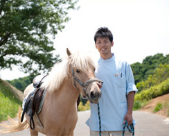 勤務している病院では、馬の飼育をしており、動物看護士の仕事のほかにこの馬などを使った動物介在療法を行っています。僕は馬班に所属し、動物看護士としての仕事のほかに、その馬の飼育を担当しています。学校で授業を教えてくださっていた院長からそのことを聞くまでは、動物病院がまさか馬を持っているとは思っていなかったです。この病院には、女性の動物看護士は10名以上、男性の看護士が3人名いますが、業務内容が多岐に渡るうえ、男手が少ないので、力仕事である馬や作業の担当をしています。馬の作業があったり、トラクターを動かしたりしているので、他の看護士さんに比べたら、外に出る機会は多いですね。病院の近くにある病院が持つ牧場で、馬のふれあいや障がい者乗馬を行っています。初めて障がい者の方々と接する機会も持てました。馬のイベントは、高齢者乗馬にも参加しました。そのときのお年寄りの表情が生き生きしていて、「また乗りたい」といっていたのはうれしくて、やってよかったと思える瞬間でした。僕自身が馬に乗るのは楽しいので、それを多くの人にわかってもらえてよかったと思います。