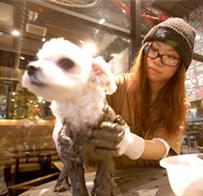 Door to Door(株式会社ドアトゥドア)には美容院だけでなく,カフェもありますし、最近では自転車も売っています。忙しいときは美容のお手伝いをしたり、トリミング以外にもいろいろな仕事をしています。トリミングに関しては,ご予約のお客様の10名ほど担当をしています。ここではペットエステで泥パックとマイクロバブルなどをやっているので、働きながら覚えました。いろいろなことができるのはとても刺激になります。