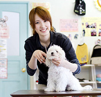このお店は、犬の生体販売、トリミング、ホテル、商品販売をしています。トリミングの授業はもちろんですが、犬の病気や成長期など、トリミング以外の授業を学校で学べたことが本当によかったです。トリミングしながら接客することもあるほど忙しい毎日ですが、仕事が本当に楽しいです。いちばんかわいい子犬たちと一緒にいられることも楽しさのひとつです。愛情を込めて育てているワンちゃん(生体)の飼い主様が決まることは仕事のやりがいのひとつです。また、お客様からのお褒めの言葉や、噛み癖のある犬がだんだん慣れてきて心を開いてくれたのを感じるときは、本当にうれしいです。就職してから自分が成長したと思うのは、向上心です。「こんなカットをしてあげたい」と、自分から提案していこうと思うようになりました。研修を経験して、生体販売をしているショップを就職先に希望したのは、犬を育てるということを通して飼い主さんたちと接して行きたかったから。トリミングだけでなく、子犬の育て方をはじめ、犬の飼育に関する相談相手、アドバイザーになりたい。目標はトータルケアのできるトリマーです。