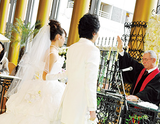 - 宗教色のない挙式スタイルで、進行や誓いの言葉などすべてが自由とされる。両親や親戚、友人などの前で永遠の愛を誓い、列席者全員が立会人・証人となる。牧師などに代わり、列席者の中から立会人代表を立てて挙式を進行する