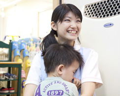 仕事をする上で心がけていることのなかで、一番はお子様の病状を悪化させないでご家庭に返すことです。前日に明日は誰が入るのかがわかっているときには、家に帰ってその病気について調べたり、周りの先輩にどのようにしたらよいのかを聞くようにしています。また、病気が移らないようにしなくてはならないので、体調管理も大切ですね。まだまだ勉強中ですが、医療知識は欲しいと思っているので、ここで学ばせていただきながら、仕事をしていきたいと思っています。そして、将来は乳児院に行けたらいいなと思っています。今は、お母様方からもお子様からも信頼される保育士になりたいです。それは、人としても、保育のやり方でも。お母様が病気のお子様を預けることは、とても不安です。特に初めて来られる方は心配ですし、初めて会った保育士について「この人、大丈夫かしら?」と思われないように。ここでは、どの保育士に預けても、誰が対応しても安心だと思っていただけるようになりたいです。そのために心がけているのは「笑顔」です。「今日預けてよかったです」とか「本当に助かりました。安心して仕事ができました」とお母様が帰ってくださったり、お子様も病気のためにここにくるので、本来ならば来ない方がいいんですけれど、そのお子様が「楽しかった、また来たい」って言って帰るときには、よかったなと思います。この仕事に興味のある人は、保育の資格、医療の知識、病気のお子様の心理ケア、お母様方の心理ケアなど、すごくやりがいがありますし、まだ数も少ないので、是非目指してほしいと思います。