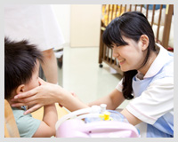 仕事をする上で心がけていることのなかで、一番はお子様の病状を悪化させないでご家庭に返すことです。前日に明日は誰が入るのかがわかっているときには、家に帰ってその病気について調べたり、周りの先輩にどのようにしたらよいのかを聞くようにしています。また、病気が移らないようにしなくてはならないので、体調管理も大切ですね。まだまだ勉強中ですが、医療知識は欲しいと思っているので、ここで学ばせていただきながら、仕事をしていきたいと思っています。そして、将来は乳児院に行けたらいいなと思っています。今は、お母様方からもお子様からも信頼される保育士になりたいです。それは、人としても、保育のやり方でも。お母様が病気のお子様を預けることは、とても不安です。特に初めて来られる方は心配ですし、初めて会った保育士について「この人、大丈夫かしら?」と思われないように。ここでは、どの保育士に預けても、誰が対応しても安心だと思っていただけるようになりたいです。そのために心がけているのは「笑顔」です。「今日預けてよかったです」とか「本当に助かりました。安心して仕事ができました」とお母様が帰ってくださったり、お子様も病気のためにここにくるので、本来ならば来ない方がいいんですけれど、そのお子様が「楽しかった、また来たい」って言って帰るときには、よかったなと思います。この仕事に興味のある人は、保育の資格、医療の知識、病気のお子様の心理ケア、お母様方の心理ケアなど、すごくやりがいがありますし、まだ数も少ないので、是非目指してほしいと思います。