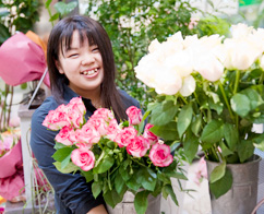 時間も求められます。駅の中にショップがあるので、あと5分で電車が来るからという方もいますし。入社した時に比べたら、早く作れるようにはなっていますが、アレンジは、日々勉強。先輩を見たり、他の店舗の作品を見たりしています。色合わせなどに自分のカラーが出るようです。自分の好みの花や色を選ぶので。お任せでと言われれば、かなり自分の好みになってしまいますね。今、店長から言われている私の今期の目標が「大人の品格を身に付ける」こと。本を読んでみようかなとか、高級店の接客を見てこようかなとか考えています。お客様の年齢層も幅広いので、お客様にあった接客をしないといけないなと思っています。お店にいらした人から、あの人がいるからお願いしようと言われるようなフローリストになりたいですね