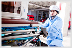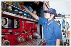 私は第一大隊所属ですが、第二、第三とあり、仕事は朝の8時30分から次の日の8時30分までの3交代制です。今は、火災のときに出動し、ホースをのばしたり、はしごを持っていったり、教えてもらいながらやっています。現場は大変ですね。火災のほか、交通事故でガソリンが漏れてしまって危ないときそれを処理するために出動したり、救急隊が3人だけでは人手が足りないというときに出動したりすることもあります。今は、国家試験のために勉強したことが全部吹っ飛ぶくらい(笑)勉強しなくてはなりません。最初は、救急の仕事ができなことが不満でしたが、隊の先輩と話しているときに、救急隊が活動しているときには消防隊に救命活動で来てもらったり、事故で救急に呼ばれたときもレスキューで来てもらったり、救急が独自で仕事をしているのではなくて、消防は消防車と救急車の歯車が噛み合って現場の活動ができるんだというのがわかりました。今はまだ救急にはあまり関わってはいないのですが、今の仕事も大事だと思っています。先輩方に紐の結び方など細かなことで注意を受けるのですが、そういう細かいことに気づけないと、現場に出たときに重要なことに気づけないので、観察力や気遣いはどの先輩方もすごいなと思います。そして、この仕事は人とのコミュニケーションが一番大事だと思います。そして、使命感や責任感。命を預かるわけですから、病状などを悪化させないように気を遣い、患者さんのことを考えて行動します。また、患者さんに関わる家族の方にも声をかけたりすることも。一番不安なのはそういう方たちですから。