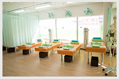 グリーンを基調とした明るく広い店内には、エステルームや酸素カプセルも完備。治療、美容、リラクゼーション、スポーツと幅広く施術が受けられる整骨院です。